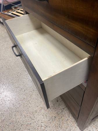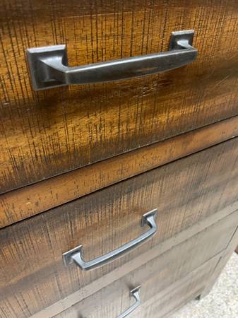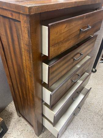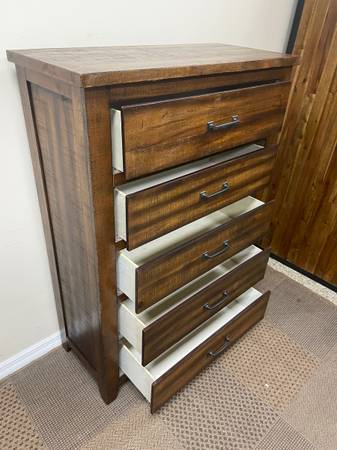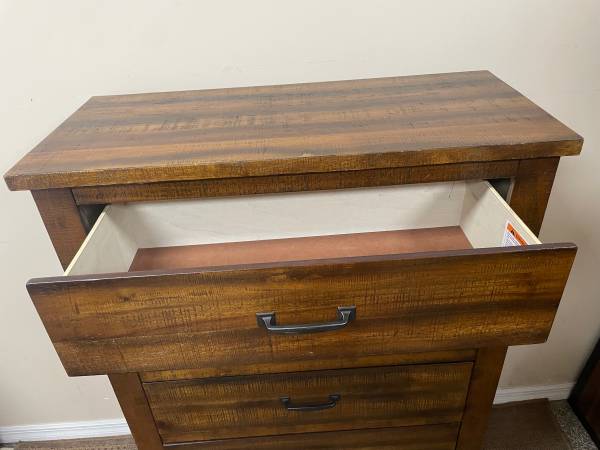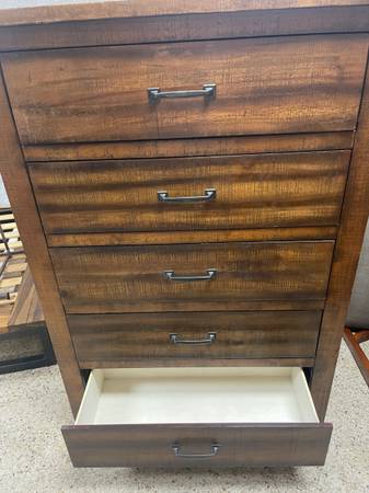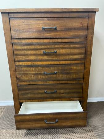 Large 5 drawer Bedroom Chester dresser, natural wood grain look. Chest 54” H x 38” W x 17” D. Top drawer is brown velvet lined, all open easy. Good clean condition, smoke free. Delivery 🚚 extra. Habla Espanol, Cómoda grande de madera, 5 cajones. También tengo servicio a domicilio.