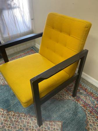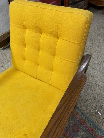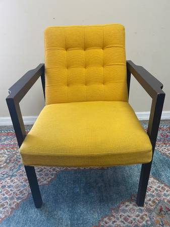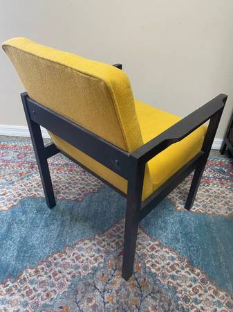 1 Mid Century Modern Accent Wood Chair, Original Kimball brand. 24.5”W x 18”Seat H x 33.5” Back H x 24”D. Strong & Sturdy, good condition. Seat cushion some staining. Smoke-Free. Delivery 🚚 extra. Habla Espanol, 1 sillón de madera. También tengo servicio a domicilio.