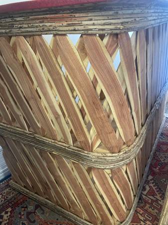 New 5ft W - L shaped Bar. Real Leather Equipale Furniture - All artisan handmade brought from Mexico. In Red or Brown. Authentic Equipal shows off classic Spanish style dining. Made of a soft hand-stitched leather hide, tanned pigskin and Mexican cedar strips that create a one of a kind rustic feel. Brown Bar Has a scratch on top from Transport. 60” W x 35” D x 44.5” H. Delivery extra Nuevo Barra Equipale