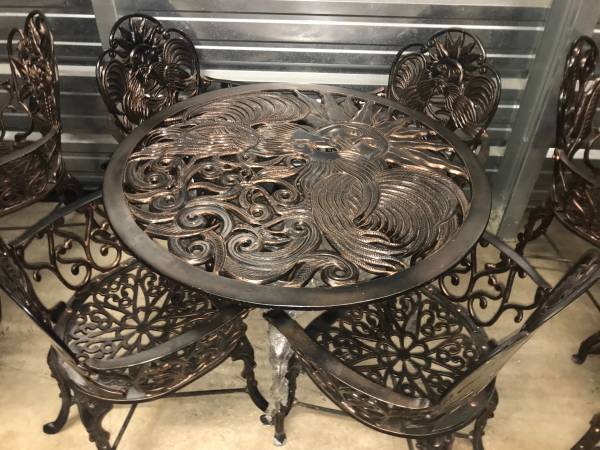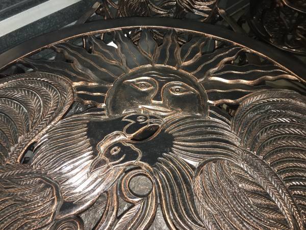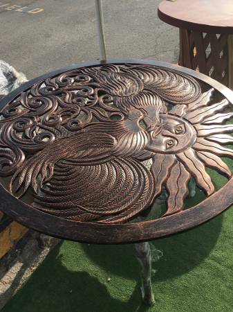 New beautiful cast ALUMINUM Rooster and Sun design patio dining table and 4 strong aluminum chairs. Artisan made Mexico design you will not find here. Aluminum does not rust. Center hole for an umbrella. 39 1/4” x 27” h x Chairs 23 1/4” x 16.5” d x 34.5” H. Delivery extra. Habla Español Nuevo Gallo and Sol aluminio mesa de patio, También tengo servicio a domicilio.