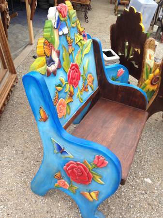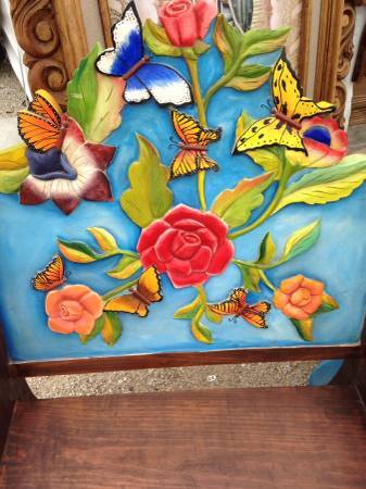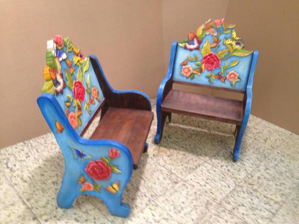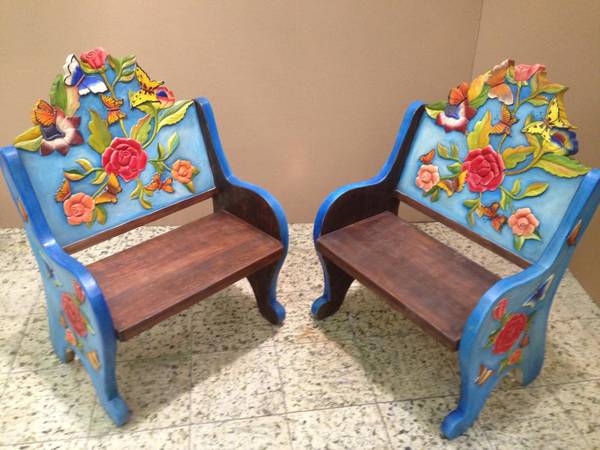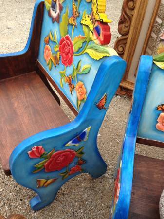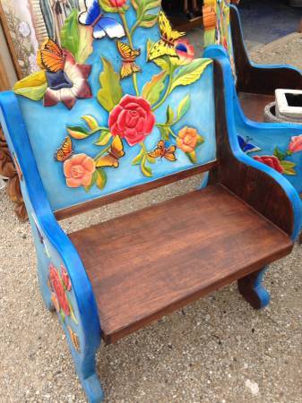 2 New beautiful hand-carved butterfly and hand painted mariposa 🦋 bench seats. Artisan made in GTO Mexico. $275 each c/uno or $500 for both 24” D x 27.5” W x 39” H. Delivery 🚚 extra Habla Español...