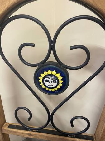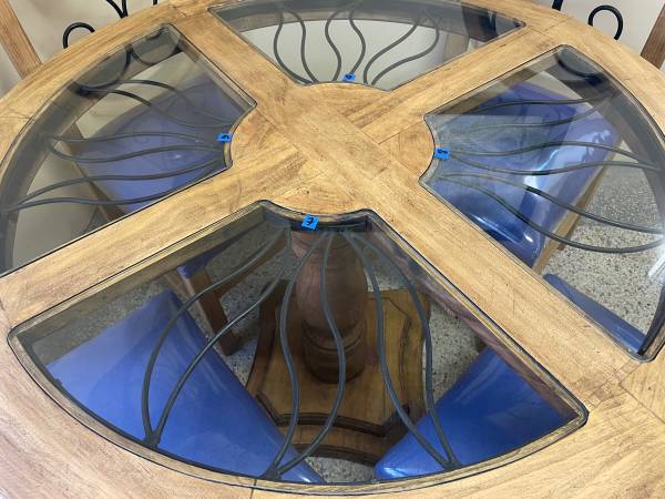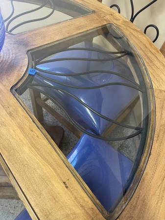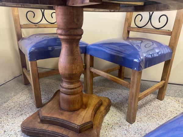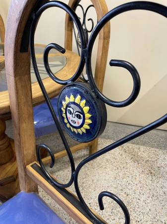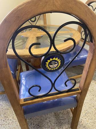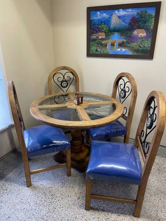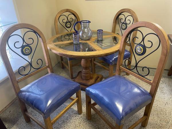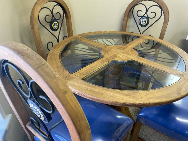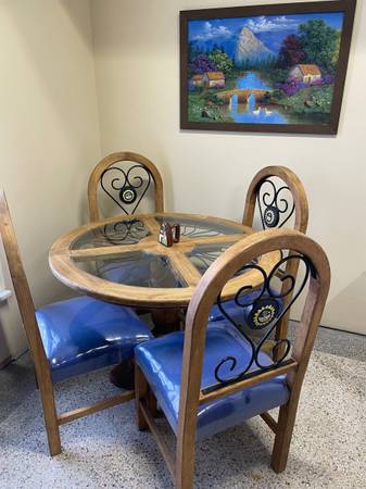 3ft 7” W New Real Wood Kitchen Dining Table with Glass. 4 Blue padded Chairs. Artisan authentic rustic hand carved, hand forged Wrought Iron Design Made in Mexico. 43” w x 31” H. Chairs 20” w x 20” h x 44” H. Delivery 🚚 extra. Habla Español Nuevo muebles, pagos aceptados. También tengo servicio a domicilio.