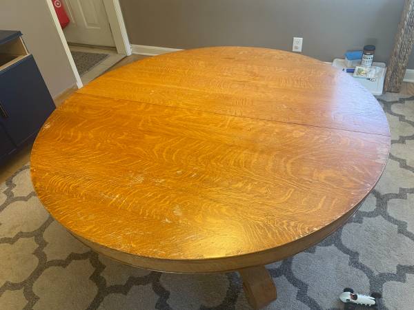 I have a round dining table, solid wood with veneer, and 5 dining chairs. It also comes with 3-4 leaves, which extends this table to accommodate a huge dinner party! It has signs of age, and would...