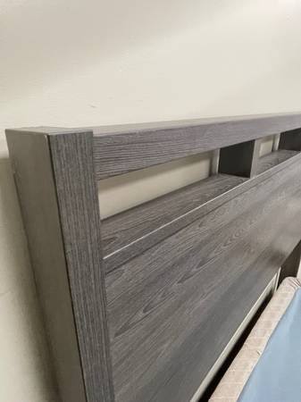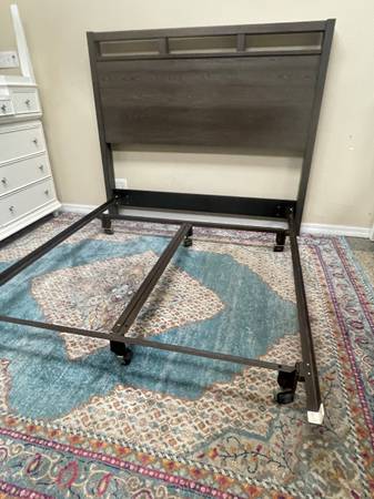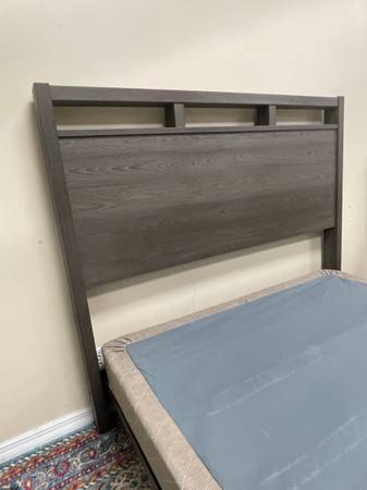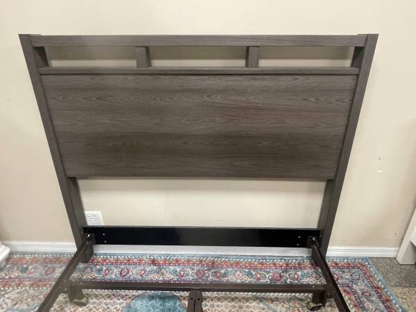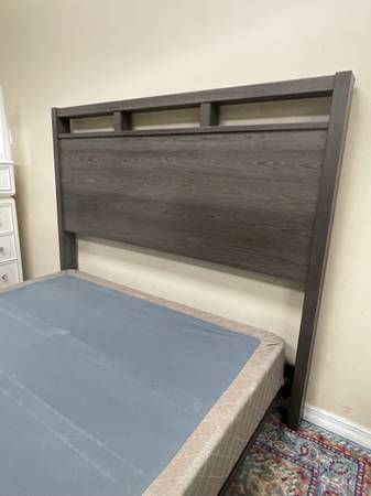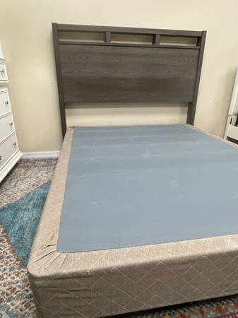 Queen headboard brownish gray 57β H x 66 1/4βW x 4β D. Tan 9β Boxspring and metal rails. Very Good Clean Condition. Smoke-free. Delivery π Extra. Habla Espanol, TambiΓ©n tengo servicio a domicilio....