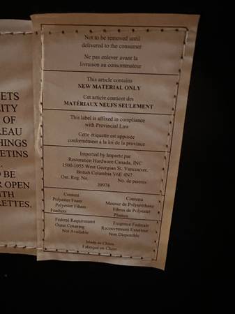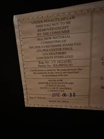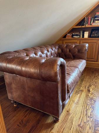 This couch is a beautiful, tufted, dark brown color with no rips, tears or stains. Seat cushions and cushion covers are removable. The feet are made of hardwood and fitted with antiqued brass casters. Down-feather fill seat cushions feature feather and down wrapped around a polyurethane foam core. Non-smoking home with no pets other than a caged, guinea pig who has never been near the couch.
