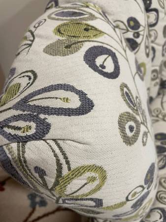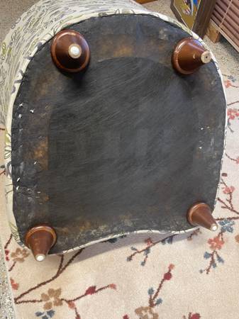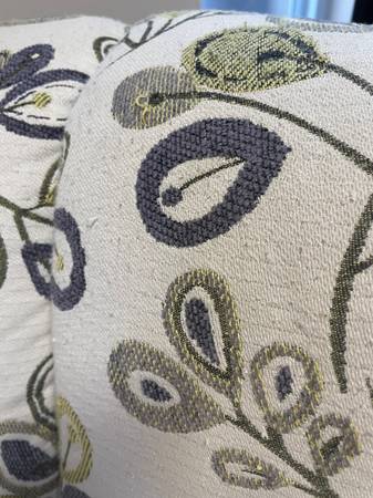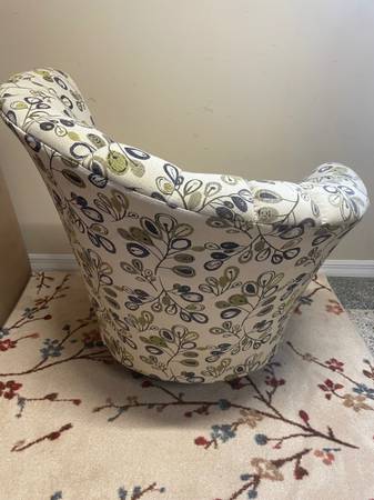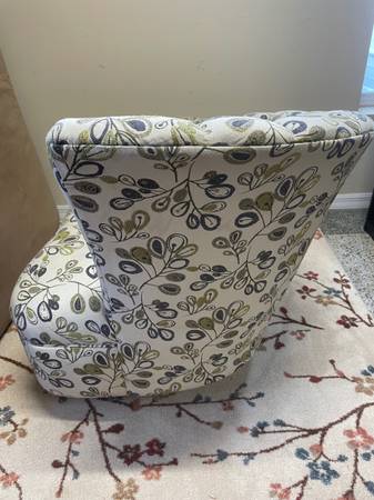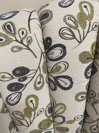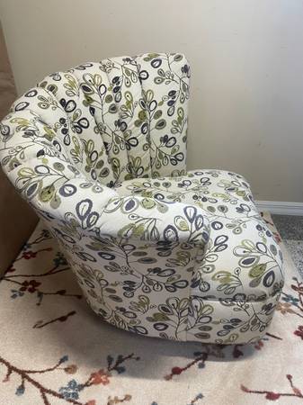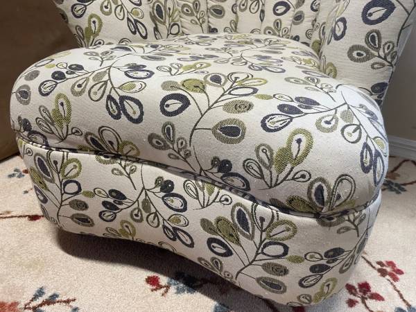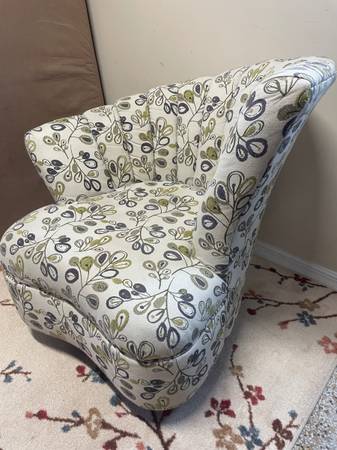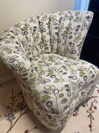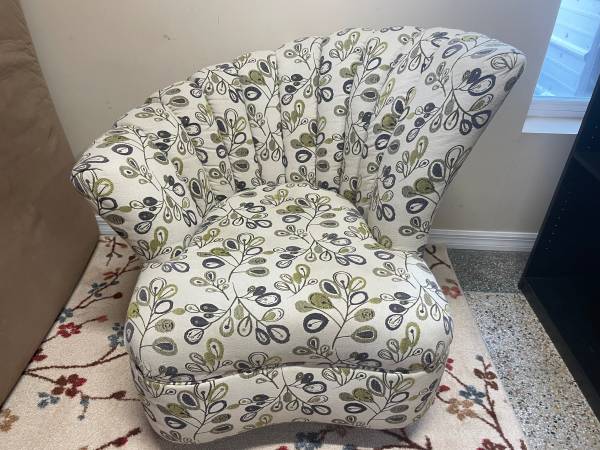 1 Seashell Fan Back Accent Chair with Wood Feet. Good Clean Condition, smoke-free. Beige with a lime green and eggplant colors. 33βD x 17.5β Seat H x 36β H Right Side Back x 26.5β Left side back. Minor snags in material donβt notice unless very close. Delivery π extra. Habla Espanol