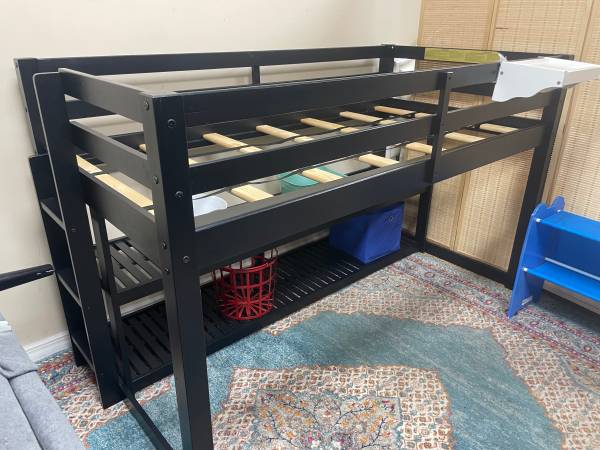 Kids Twin Black Wood Loft Storage Bed, platform slats, guard rails. Clean 6.5” mattress. Underneath 2 Large open shelves for storage. For younger kids as not too tall. 48” H x 42” D x 82” Long. Strong and Sturdy. Good clean condition, non-smoking. included free some storage bins, white wood over the Railing Shelf and a Mickey shoe shelf. Delivery 🚚 and reassembly extra. Habla Espanol, Cama alta de madera para niños con 2 estantes grandes incorporados. También tengo servicio a domicilio.