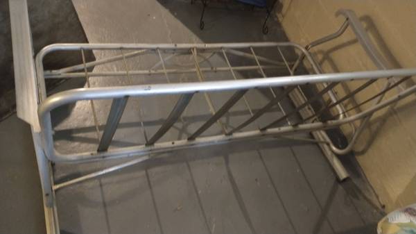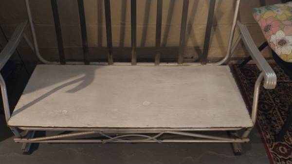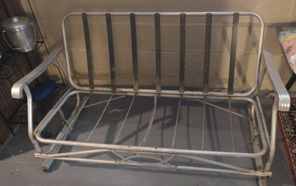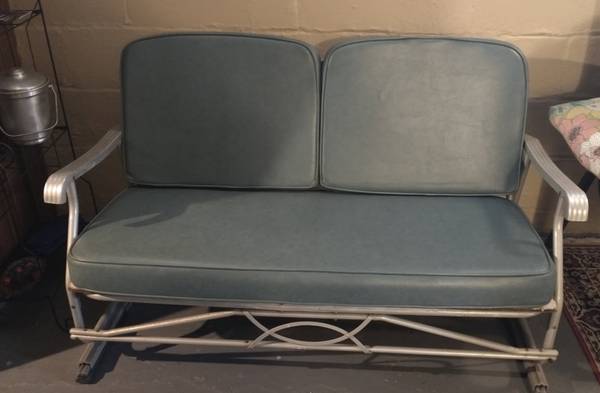 Aluminum glider couch. 4 feet wide. Removeable custom vinyl covered zippered cushions. Cushions are supportive. No rips, tears, or stains. Easy piece to move around. Color is a neutral blue-gray. Nice seating for patio during summer months or indoors in a rec room.