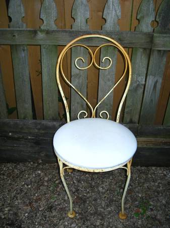 VINTAGE YELLOW WROUGHT IRON ICE CREAM PARLOR CHAIR $25.00 CASH ONLY PLEASE CALL OR EMAIL JEAN THANK YOU FOR YOUR INTEREST
