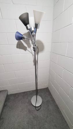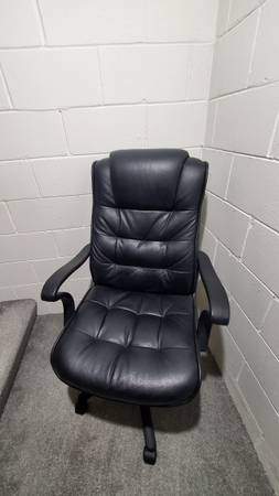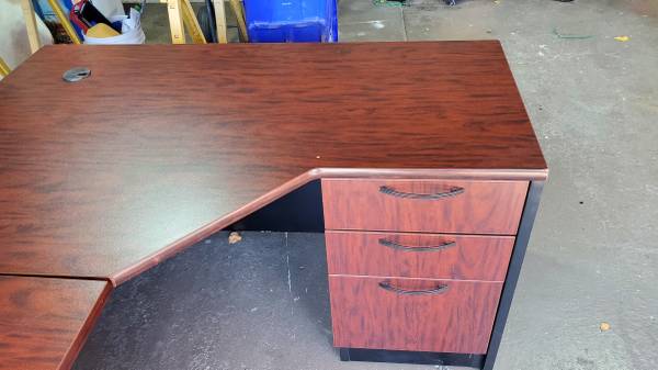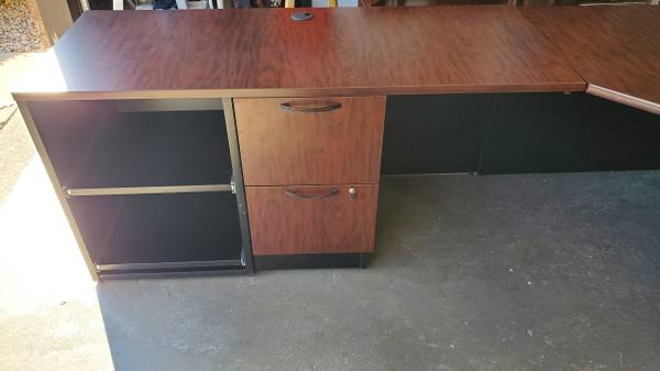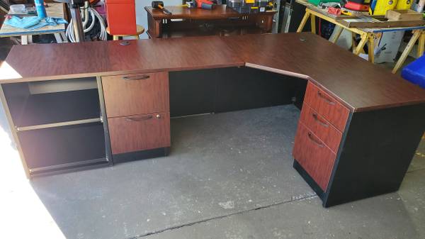 Office desk, Office chair, book shelf and floor lamp. Office desk L shape 96"x54" , book shelf 30"x 71"x 12". $75.