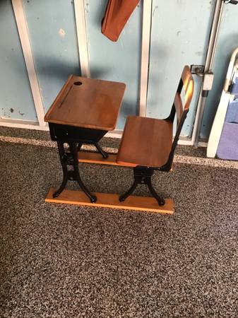 Refinished old school desk. Mounted on oak boards. In very good condition