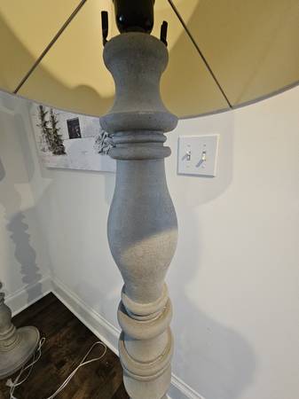 These two floor lamps have never been used. The measurements below are approximate. Being sold together. Very substantial and heavy. Gray faux wood. Unknown brand. Height 61 in including shade Base...
