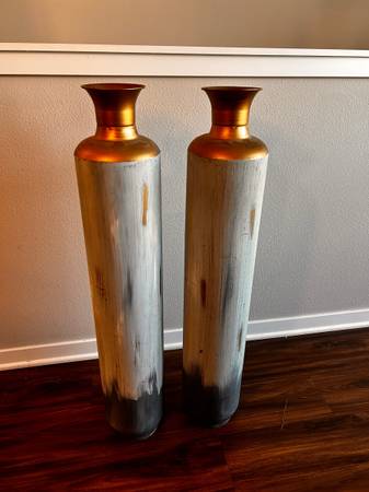 You don’t always need flowers to make a vase stand out—this tall blue floor vase speaks for itself. Its abstract design blends soft blues with shimmering gold accents, creating a striking statement piece for any room. Made from sturdy metal, it’s built to last and add instant style to your space.