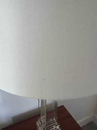 Beautiful heavy crystal base table lamp. Rectangular base in great shape, lamp shade included with bulb. Pick up only- no delivery 20” H (base). 34”full height
