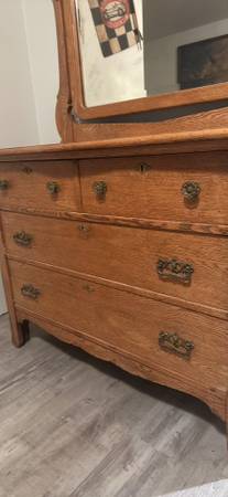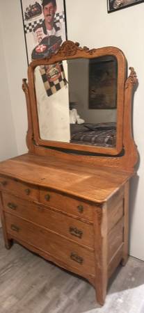 Selling antique Bed with matching dresser and mirror. Bed is a double size, has side rails, headboard and footboard. Both pieces are solid wood, not sure what kind. Bed had been painted and stripped. Maybe could be stripped a little better. Mirror is fully intact, no chips or breaks. Comes from smoke free home. Measurements are in the pictures. $300 Cash Serious inquiries only.