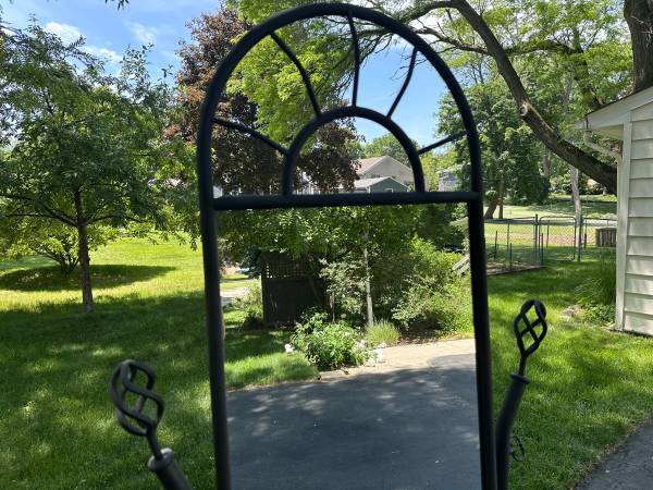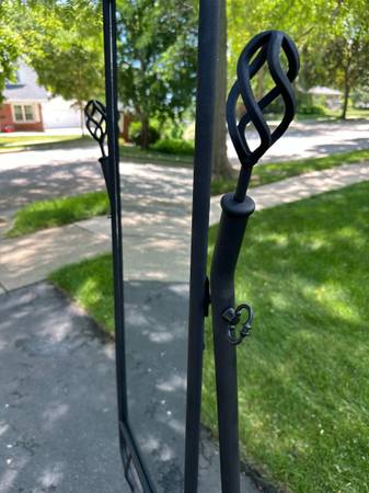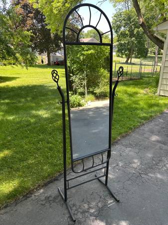 New Black Metal Tilting Adjustable Standing Mirror Height 73". Base 18" x 21-1/4". Glass mirror itself 16" x 38". Features curved sunburst top, spiral finials, wood backer board.