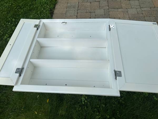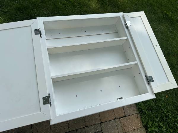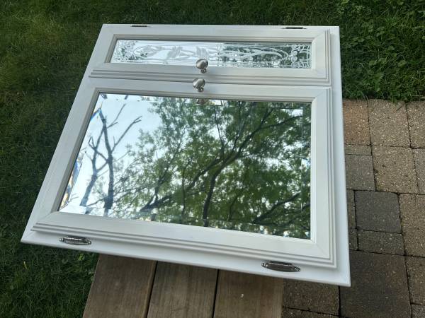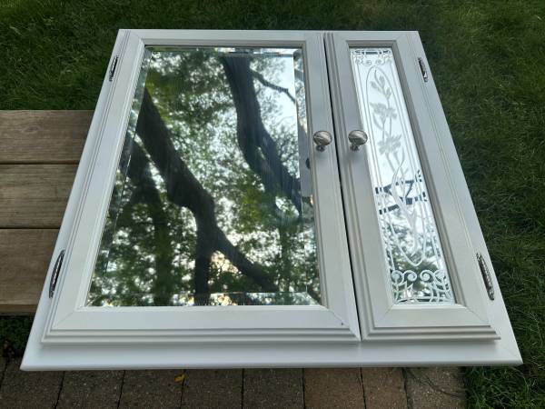 Vanity Bathroom Wall Cabinet White 2 Door Mirrored Perfect clean condition Features beveled mirrors, 2 adjustable shelves, magnetic door, predrilled for hanging Measures 25" W x 26" H x 4.5"