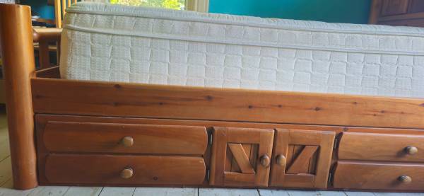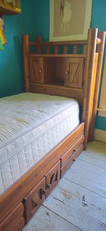 Winnie the Pooh Twin size bed with pedestal with extra storage 2 drawers and storage cubby. Bookcase head board. Comes with pillow top matress.