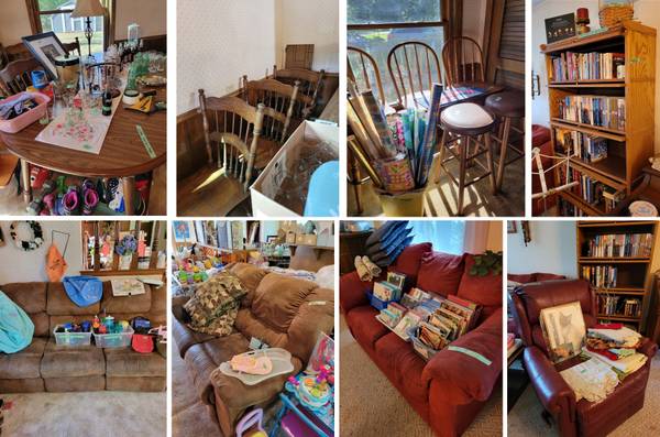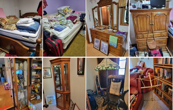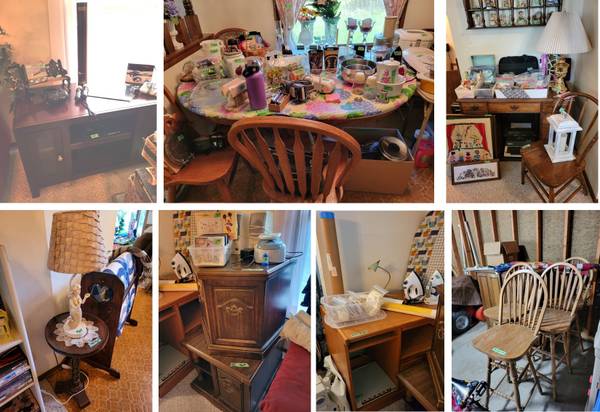 Queen size bed/mattress/box spring, dresser/mirror/matching dresser, two/brown/love/3 cushion recliner couches, two red/love & 3 cushion couches, easy chairs, wooden chairs, end tables, wooden backed counter chairs, cushioned counter stools, hall tree, vintage school desk, oval kitchen table/x-tra leaf/3 chairs, oval oak table, 2 curio cabinets, quilt rack, bookcases, wall shelves, horse collar, TV stand, coffee table, 2 wooden desks, large wood rocking chair, shadow box, children’s picnic table, changing table, toy chest, youth bed/mattress.
