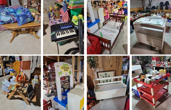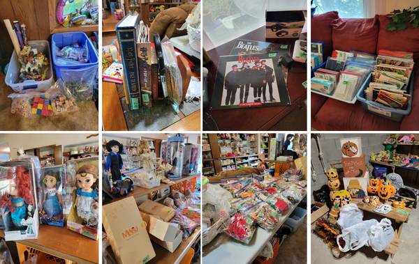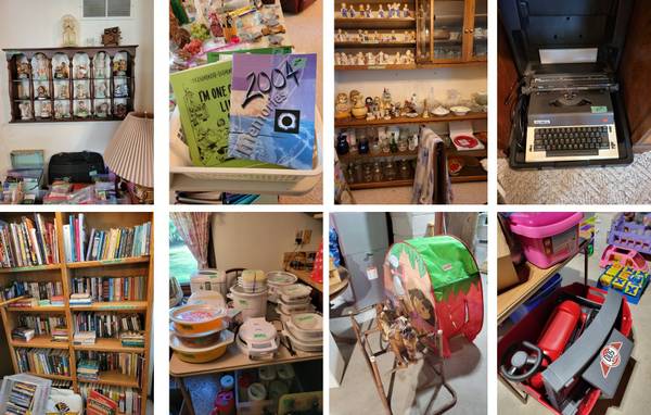 Pyrex/Corning/Corell dishes, Tupperware, small Appliances, linens, clocks, dishes, cook/bakeware, utensils, baskets, candles/candle holders, lamps, books, puzzles, collectibles, Packer/Brewer/WI/College apparel, Upright vacuums, silk flowers, table lamps, women’s clothing, purses/handbags, office supplies, small plastic storage units, porcelain/Precious moments, collectibles, , cookbooks, picture frames, hundreds of men’s collector hats, children's furniture, children's Halloween costumes, children's backpacks, books, children’s books, Harry Potter items, quilts, ironing boards/irons, Bernett sewing machine, sewing machine/cabinet, CDs, DVDs, copper mugs, Olympia electric typewriter, women’s jewelry, Pfaltzgraff dish set, framed art, globe of the world, Pak/play, women’s clothing/shoes, baby/toddler clothes, Gaming TV, Casio electric keyboard, children’s safety gates.