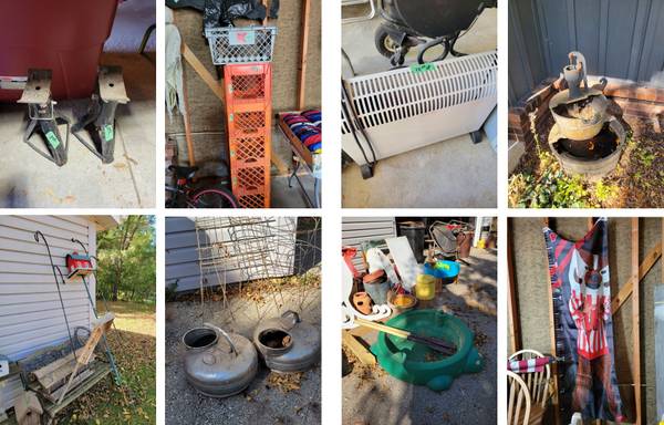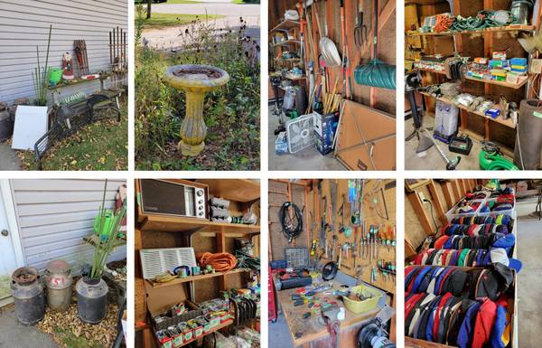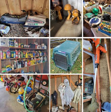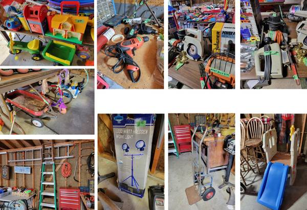 Vintage Polaris sno-mobile, metal guard/push bar for truck, lawn sweeper, lawn thatcher, pull behind garden cart, tricycle, Craftsman metal toolbox/cart, 2 6’ work benches, household supplies, garden/lawn tools, wood/aluminum stepladders, aluminum extension ladder, handcart, hand tools, lots of garden art, wooden benches, concrete birdbath, Holiday décor, 3 Christmas trees, Christmas village, pet porter, plastic turtle sandbox, electric weed-whacker, battery charger, bench vice, double halogen work light, standing bench grinder/wire wheel, nuts/bolts, electric power tools, 10” Power Miter saw, electric tools, floor jacks, Craftsman router table, child’s plastic trike/wagon, other riding toys, helmets, coolers, Reddy cannon/Remington cannon heaters, bricks/pavers/edgers, boy’s/girls bikes, plastic milk crates, child’s plastic slide, lawn chairs, tackle boxes & fishing items, space heater, KVC Comp skis, corn-hole game boards, 3-tier Coca-Cola plastic display stand.