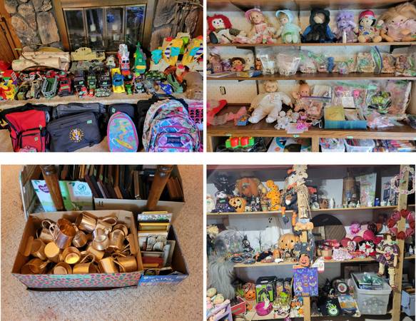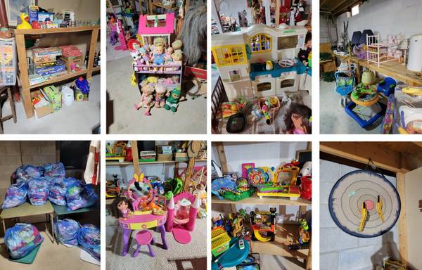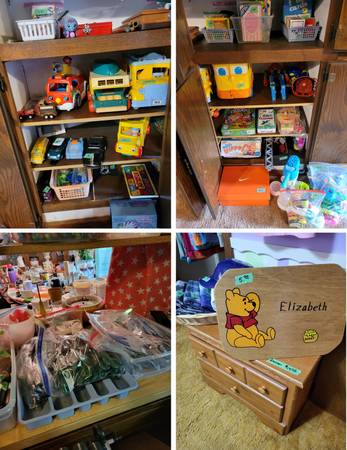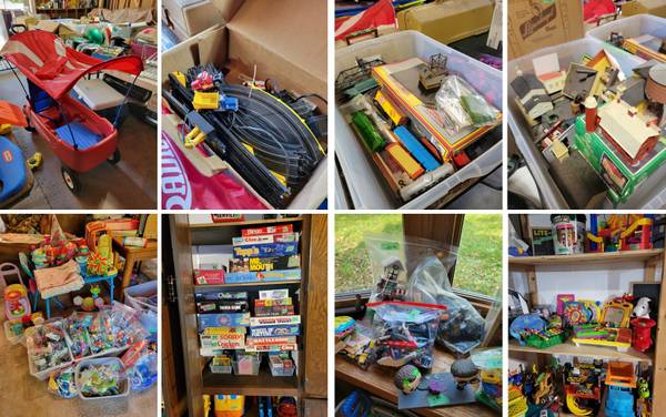 Fisher Price playsets/people, games/puzzles, LEGOs, Playskool, Lincoln logs, Locblocs, Star Wars figures, Superhero figures, Hartford/ Lincoln School Annuals-Many years, doll clothes, collectible dolls, slot car set, train set/buildings, cars, trucks, playhouse items of all sorts, covered wagon, Lemonade stand, milk cans, three Old Style light-up signs, wooden blocks, Hot Wheels Playset City, folding music stand, springy wonder horse, vintage ceramic lighted Christmas tree.