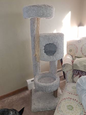 Gently used for 1 year, Like New cat tree. Made with better quality material, Wood, Not cardboard or pressboard. Carpet is in perfect condition, no shredding or tearing, except for rope attached....