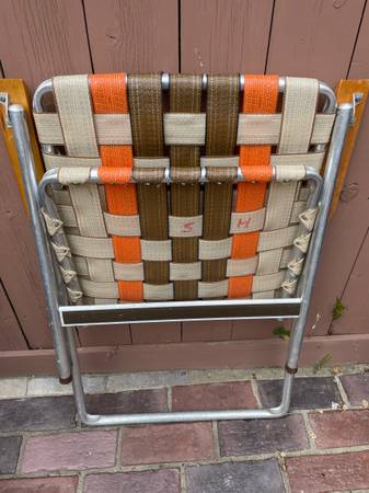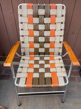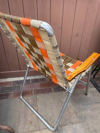 Classic Mid Century Modern Webbed Folding Patio Deck Lawn Chair. Nothing Broke. 24” W Lightweight Aluminum Frame, 17” seat H. Compact Fold. Good clean condition. Camping, park