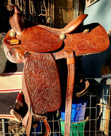 Beautiful Simco western saddle. 6" gullet and 15" seat. Completely sound and ready to ride. Comfy seat and easy to move stirrups. Meeting place is Franklin Police Station by safe exchange signs....