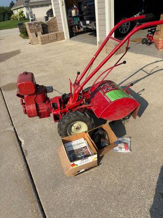 6HP Troy Built Rototiller horse model. Starts and runs great. Manuals and extra tines and parts.