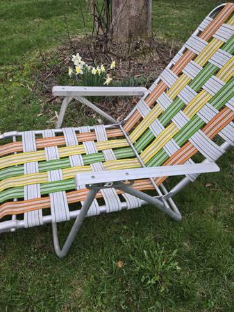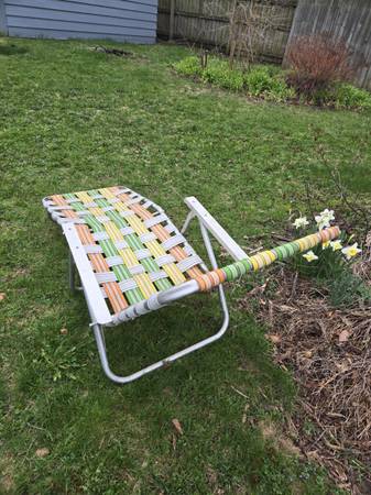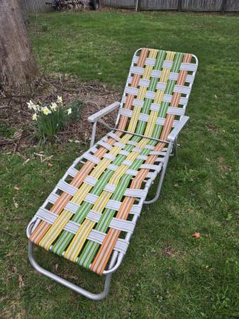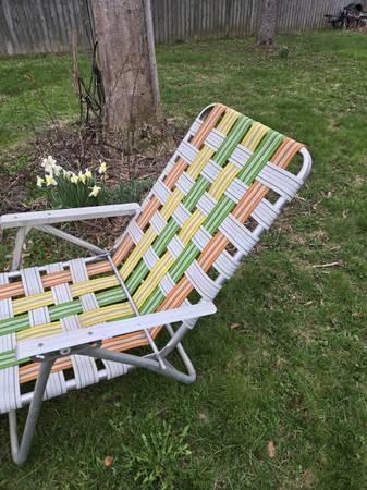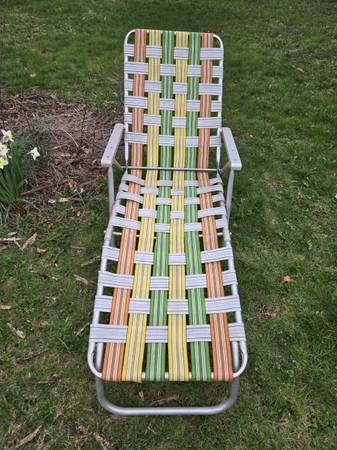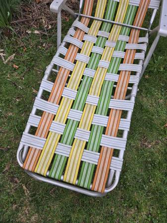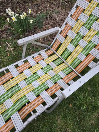 Vintage Mid Century Modern (MCM) Mod Folding Lightweight Aluminum Multicolor (Orange, Yellow, White, Green) Webbing Lawn Chair, Beach Chair, Patio