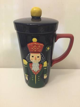 Tall ceramic mug with raised nutcracker figure on the front and holly on the back. Cover has a tight seal. This mug is unused and is in new condition. $9.00. Please respond with date and time of...