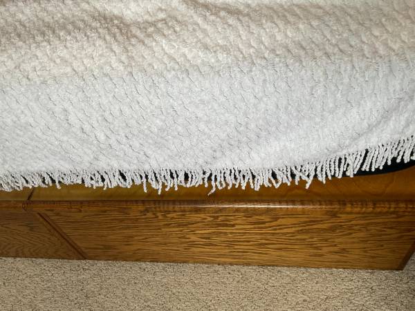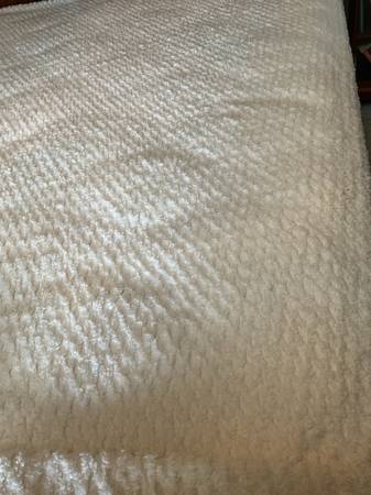 A beautiful chenille bed spread, not a vintage piece. It’s heavy and soft. The only way I know it’s been laundered is the fact that the tag shows it. The spread itself seems and looks new. It measures 58 by 108 inches…..add to that a 3 1/2 “ fringe on 3 sides. The pattern is called “diamond”. A really nice piece.