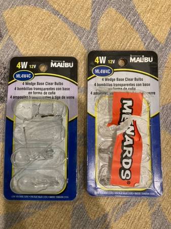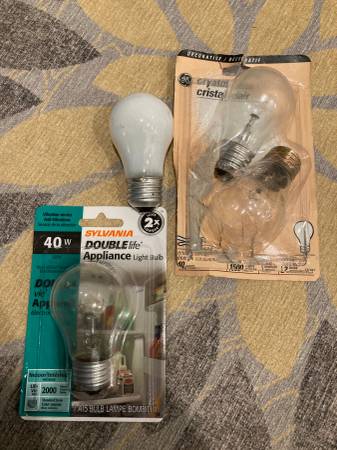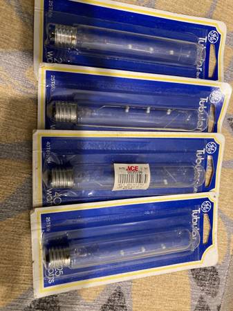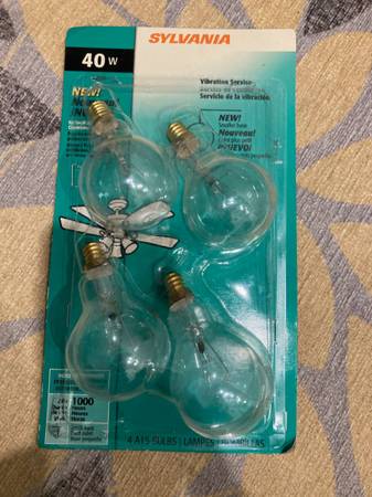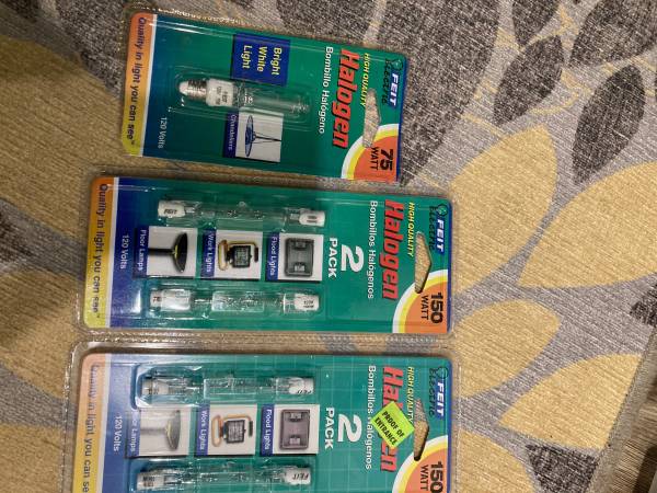 4....40 watt Bulbs $4 3 NEW Light fixtures, indoors or out. $10 each 5....150 watt long bulbs Halogen. $5 NEW Bedroom Ceiling Light $10 5....40 watt small round bulbs $5 4....4 watt 12V ML4W4C bulbs...