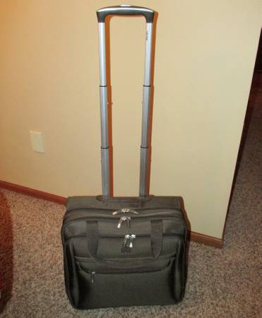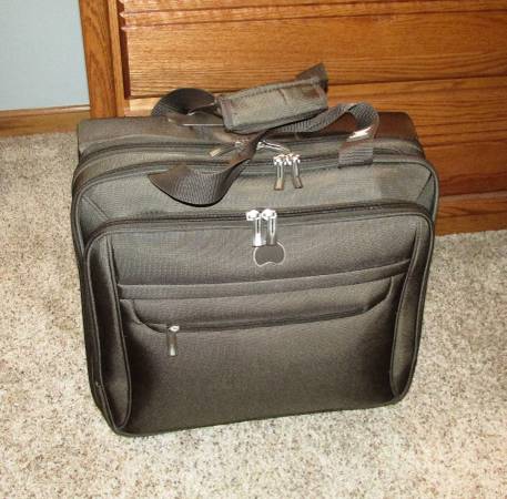 Approximate exterior dimensions: 16” high x 17” wide x 9” deep. Color: Brown. Three zippered exterior pockets with multiple interior pockets, and one with a secured holder for laptop - up to 13” x 14.5”. Main compartment has a zippered flat pocket.