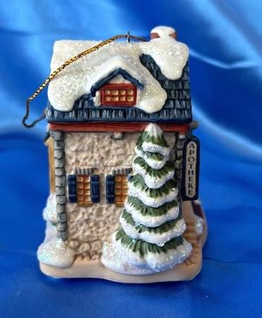 The 3 ornaments in this vintage set are: Warm Winter Wishes, Apple Tree Cottage & Village Pharmacy.