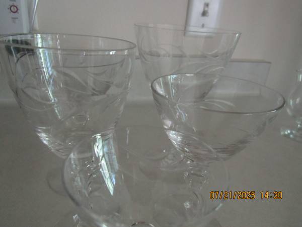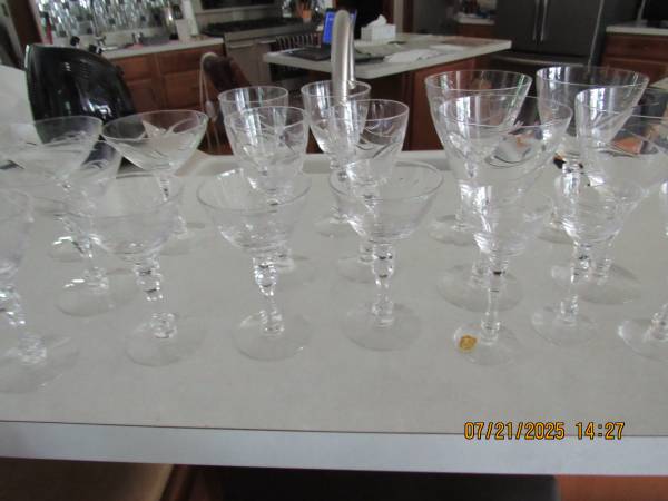 18 piece crystal glassware with small swirl 4 large wine glasses 4 small wine glasses 4 champagne glasses 3 dessert glasses 3 after dinner drink glasses As Pictured! Make Offer!!!!