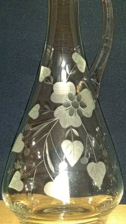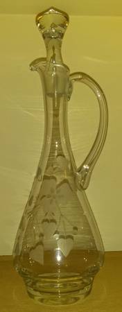 crystal decanter with etched floral pattern; about 16" tall to top of stopper