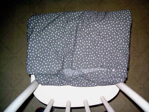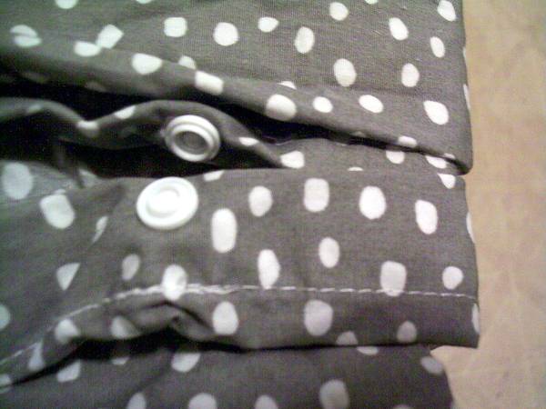 For sale is a comforter cover in good used condition. This grey and white-polka-dot cotton cover measures 62"x 84". The cover should fit Twin-Size comforters. The cover has white-colored snaps to close the side which can open.