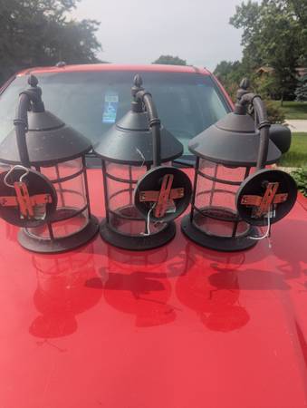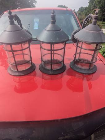 3 outdoor lights which are 16" tall and the diameter at the bottom is 8". All 3 for $50 or $20 each.