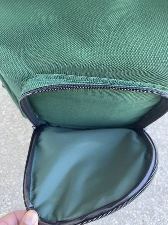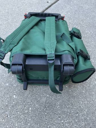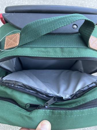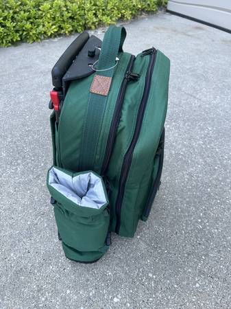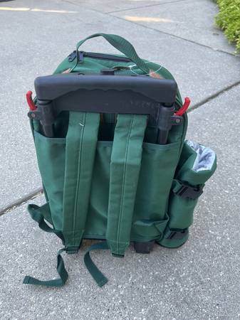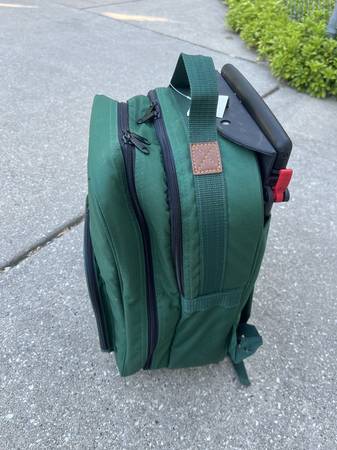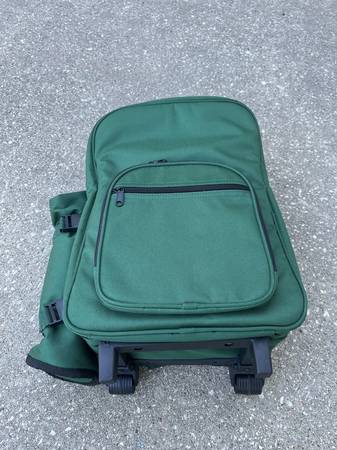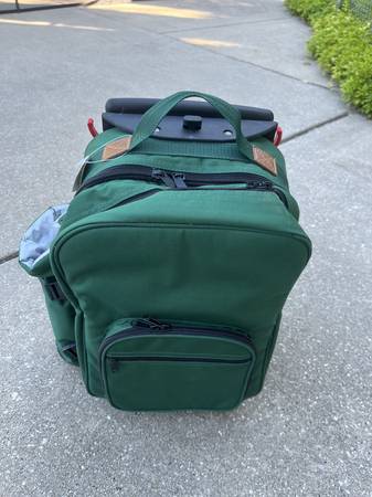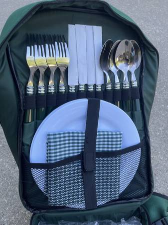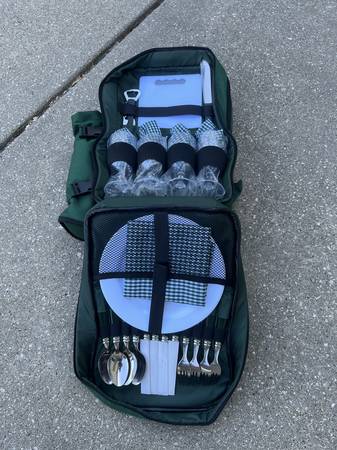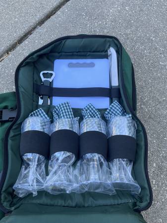 This is a brand new picnic kit for 4 people. It has never been used. It includes plates, glasses, forks, knives and spoons along with a cutting board, bottle opener and cutting board knife. The wine bottle holder is attached to the side with clips. There is a main cooler compartment for other items and two zippered front pockets. You can use this as a backpack or pull it with the extension handle with the wheels.