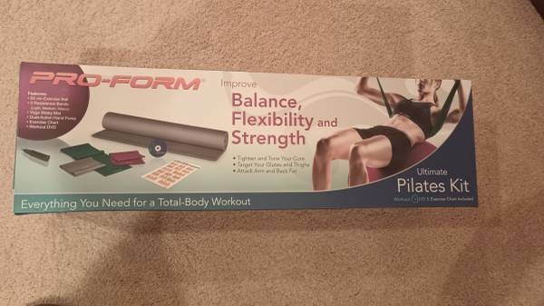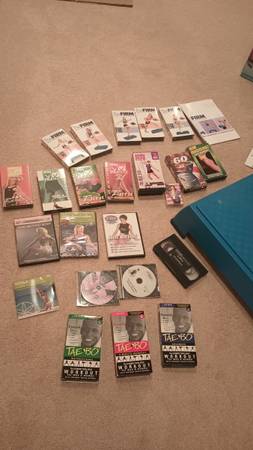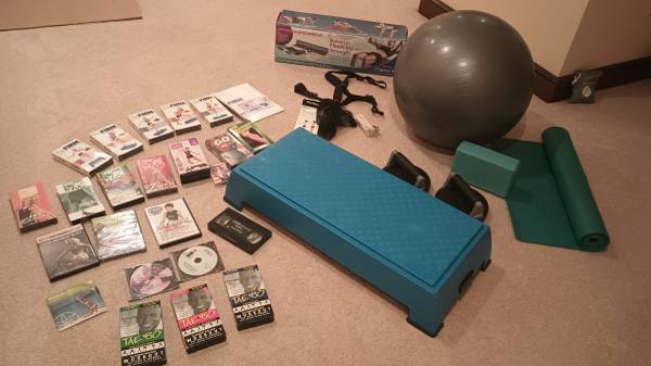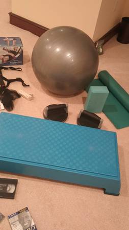 Includes Pilates yoga mat, yoga block, exercise ball, step platform workout box, ab workout circular arm set, bands with exercise manual, and lots of exercise vhs tapes, dvds, and cds. 1 walking cassette tape. ALSO includes a sealed in box, never used, Complete Pilates Kit! $50 takes all.