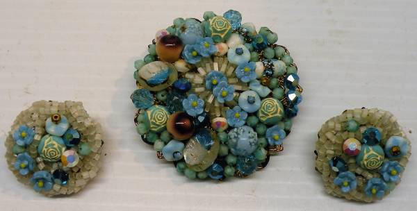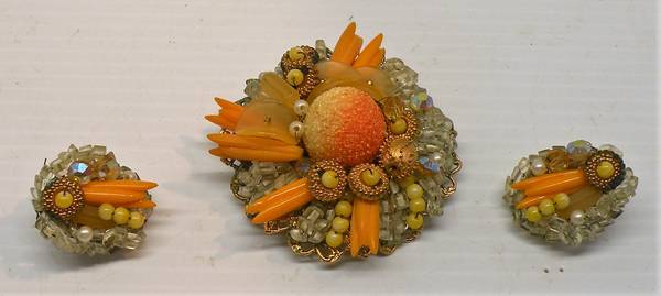 Large Vintage Designer Brooches : $75.00 each set Orange 2.5" Brooch and Pair of 1" x 1.25" Clip on Earrings Blue 2.5" Brooch and Pair of 1.5" Round Clip on Earrings