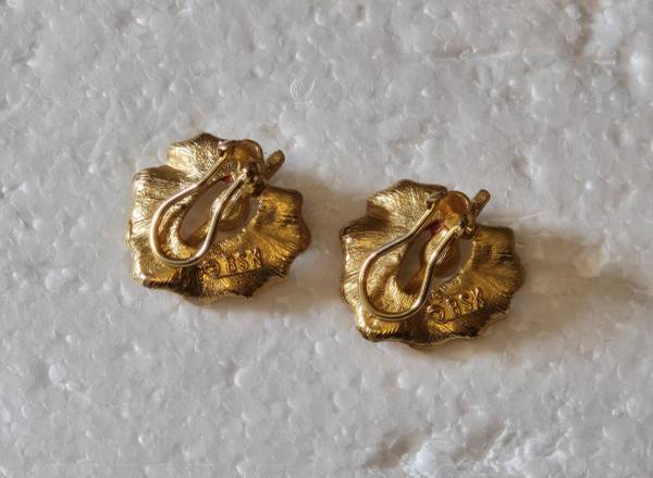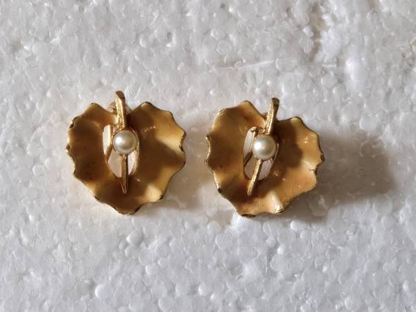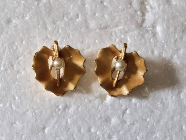 Vintage B.S.K Signed Leaf-Shaped Clip-On Earring with Faux Pearl Center
