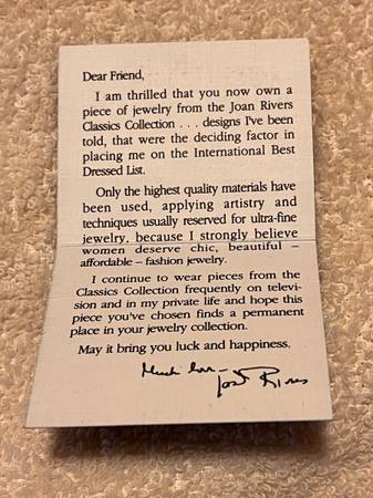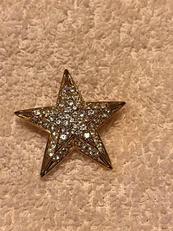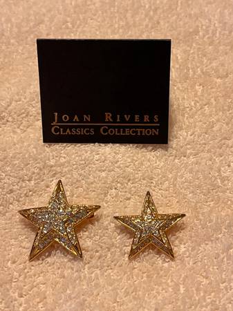 These Joan Rivers star brooches are a glamorous addition to any vintage jewelry collection. With a gold tone base and sparkling white rhinestones in a star shape, these brooches exude elegance and style. Signed by Joan Rivers, these brooches are a timeless piece that adds a touch of glamour to any outfit. They are perfect for fashion-forward individuals looking to add a touch of vintage charm to their ensemble. The larger one measures 1 3/8 X 1 3/8 inch, the smaller one measures 1 X 1 inch. Beautiful color, design and in like new condition. They come in the original box.