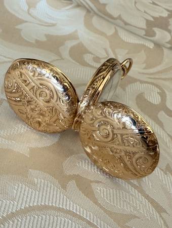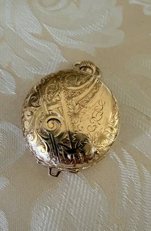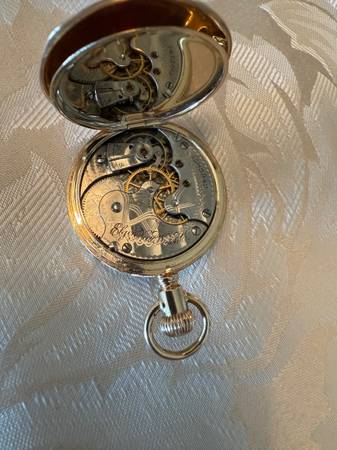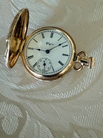 Here’s a vintage Elgin watch. Gold, gold, GOLD!! From the Elgin Watch Information site, this serial number 4583353 brings up a mfr date of 1892. Class:115 Jewels: 13 Size: 0s Grade: 59 Hunter style...