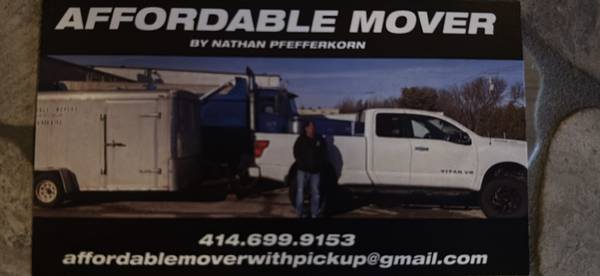 This is our 5rd year of providing Milwaukee and surrounding communities with affordable moving services. We are a hard working company with careful and courteous employees. We provide the truck, trailer and specialize in 1 and 2 bedroom moves but no job is too big or too small. We deliver furniture, appliance, boat launching, gun safes, riding lawnmowers, motorcycles, Tv's to big for the car, and removal of unwanted items to Goodwill. Just give Nate a call for a inexpensive estimate and easy scheduling. We work Sundays and holidays. We accept cash, Venmo or Zelle (414) 699-9153 affordablemoverwithpickup@gmail.com