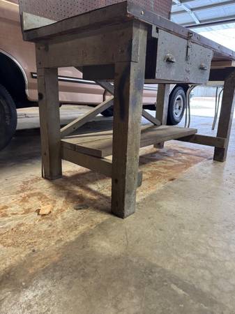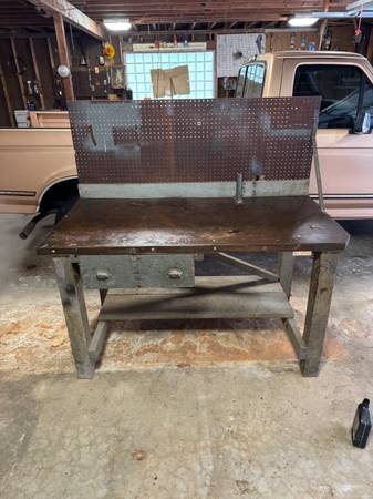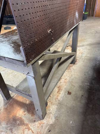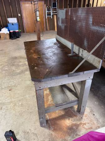 $500-- METAL TOP WELDING BENCH HAS METAL TOP WITH WOOD UNDERNEATH, VERY HEAVY AND STABLE, TABLE IS STRONG ENOUGH TO HOLD A CAR ON IT. WE CURRENTLY USE THIS ONE AS A DESK WORK STATION.