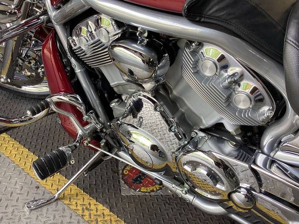 WOW FACTOR! ONLY 17,901 MILES, HD 19 AND 17 UPGRADED CHROME WHEELS, MATCHING CHROME REAR PULLEY, CHROME FORKS, CHROME SWINGARM, CHROME CALIPERS, CHROME HANDLEBAR CONTROLS AND MASTER CYLINDER, CHROME BELT GUARD, RINEHART EXHAUST, HD REAR HARD BAGS, HD TOUR SEAT, BACKREST, CRASHBAR, UPGRADED GRIPS, LEVERS, PEGS, AND SHIFTER, BRAIDED CABLES AND LINES, NEW FRONT TIRE, AND MORE! CLEAN AND LOADED CHROMED OUT V-ROD CRUISER!