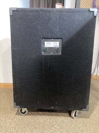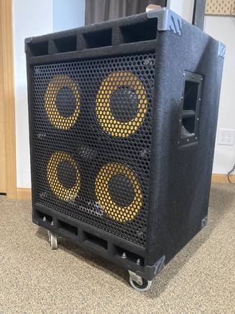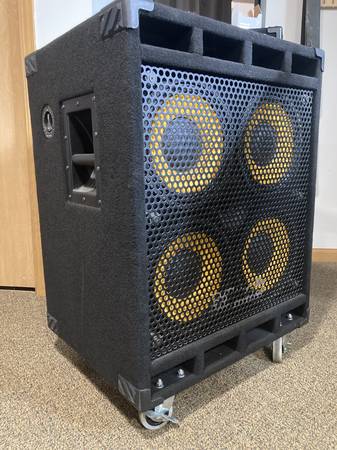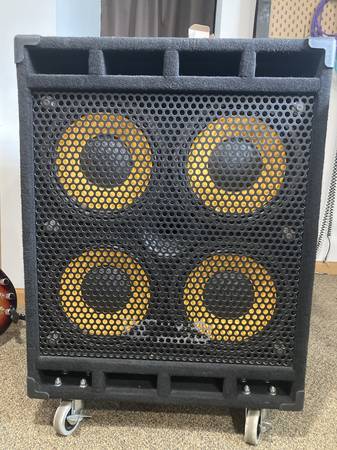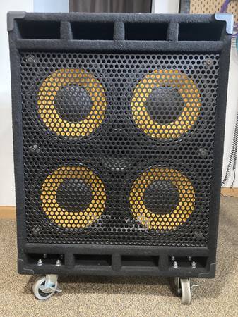 Sounds so good. Clear and punchy with a thick bottom end. And as far as 410 cabs go, it's reasonably light (appr. 55 lbs). It has good, solid casters, as well. It's missing the Markbass badge on the front, but those can be purchased from the manufacturer. These sell for $550-900 used. Save yourself a little dough and buy local!